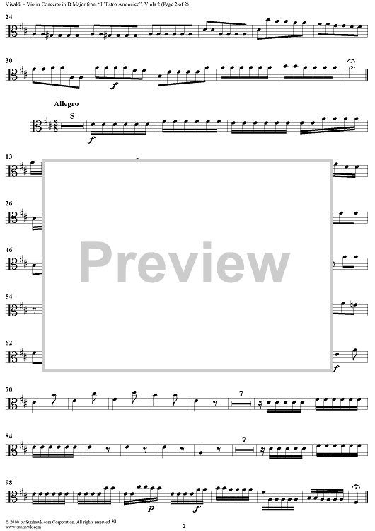 "Violin Concerto in D Major - from "L'Estro Armonico" - Op. 3/9 (RV230) - Viola 2" Sheet Music by Antonio Vivaldi