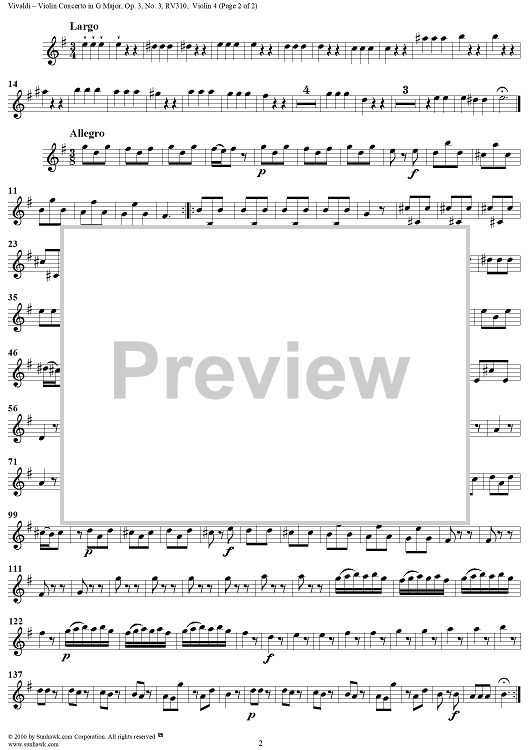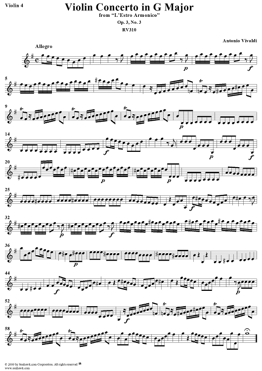 "Violin Concerto in G Major - from "L'Estro Armonico" - Op. 3/3 (RV310) - Violin 4" Sheet Music by Antonio Vivaldi