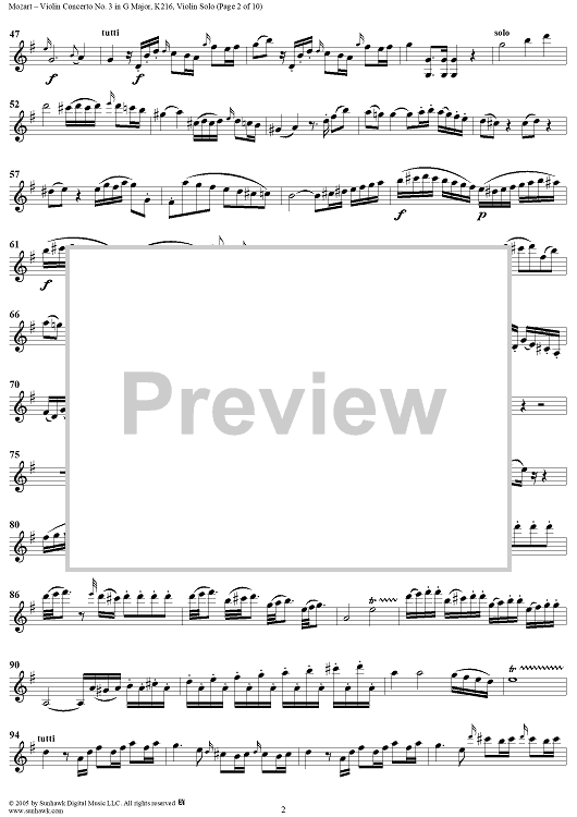 "Violin Concerto No. 3 - Solo Violin" Sheet Music by Wolfgang Amadeus Mozart