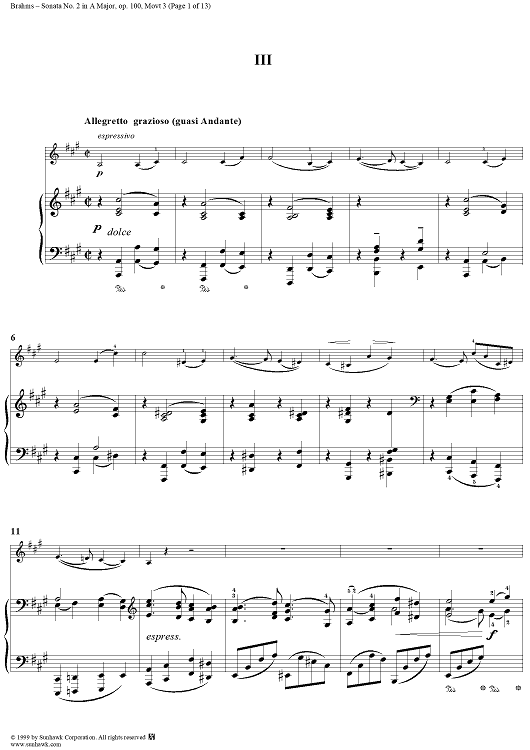 "Violin Sonata No. 2, Movement 3 - Piano Score" Sheet Music by Johannes Brahms
