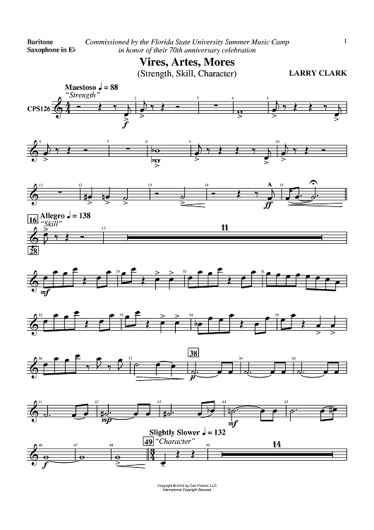 Digital Sheet Music for Vires, Artes, Mores (Strength, Skill, Character) - Baritone Sax by Larry Clark scored for Concert Band; id:430581