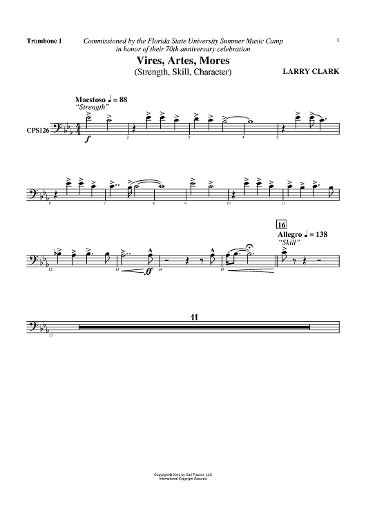 Digital Sheet Music for Vires, Artes, Mores (Strength, Skill, Character) - Trombone 1 by Larry Clark scored for Concert Band; id:430587