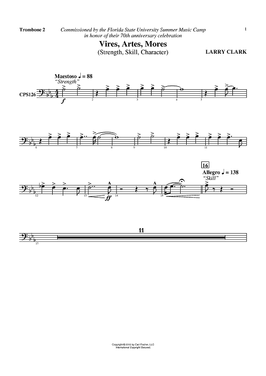 Digital Sheet Music for Vires, Artes, Mores (Strength, Skill, Character) - Trombone 2 by Larry Clark scored for Concert Band; id:430588