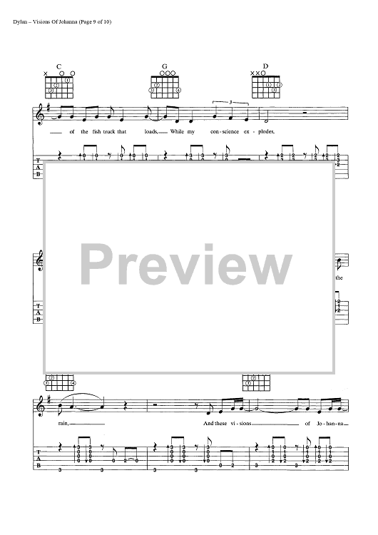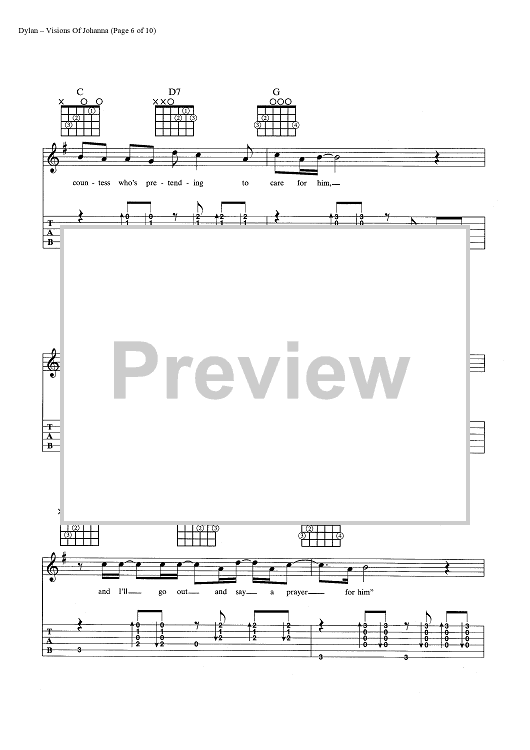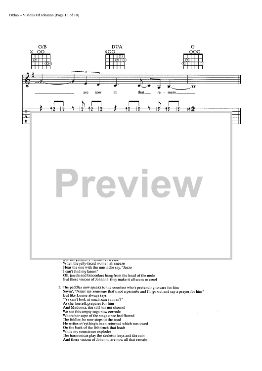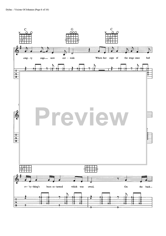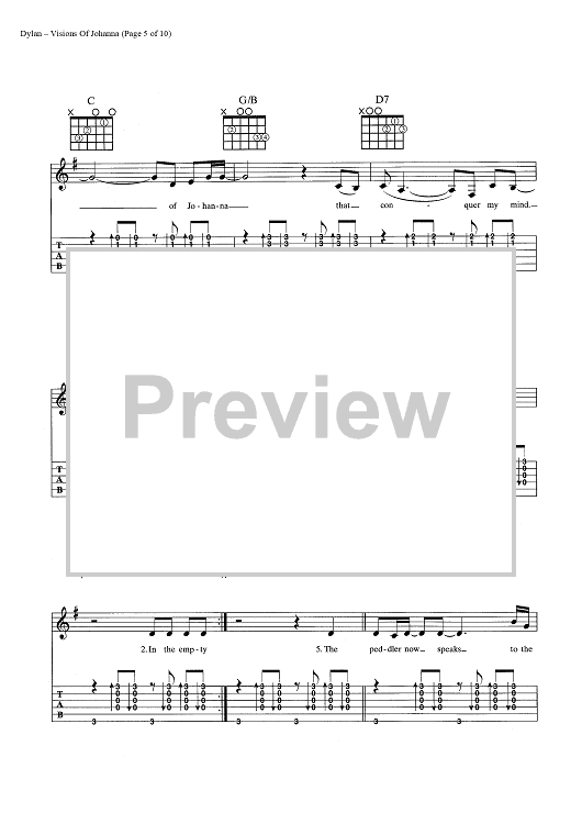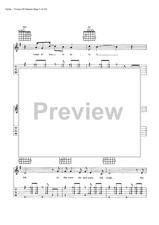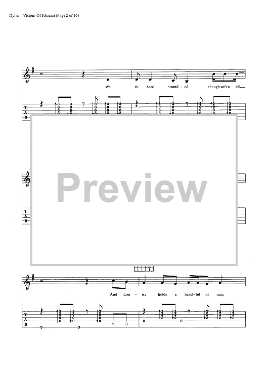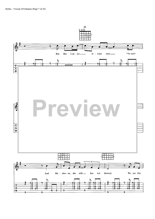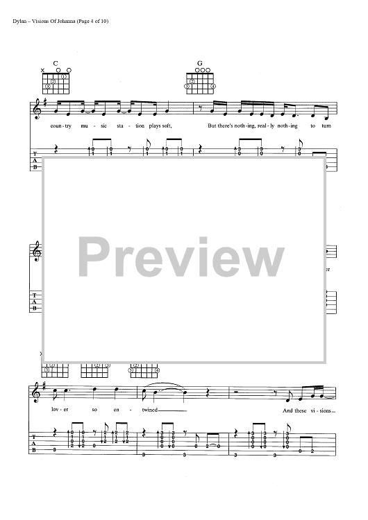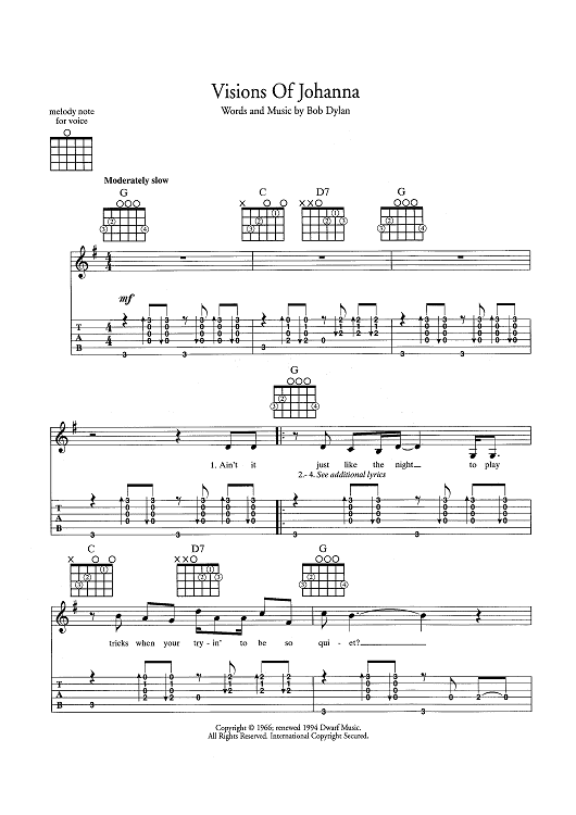 Digital Sheet Music for Visions of Johanna by Bob Dylan scored for Guitar Tab/Vocal/Chords; id:445483