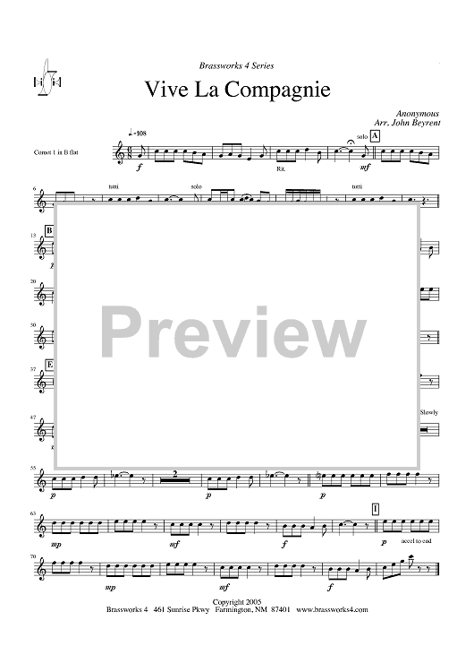 Digital Sheet Music for Vive La Compagnie - Cornet 1 in Bb by John Beyrent, Anonymous scored for Brass Ensemble; id:428371