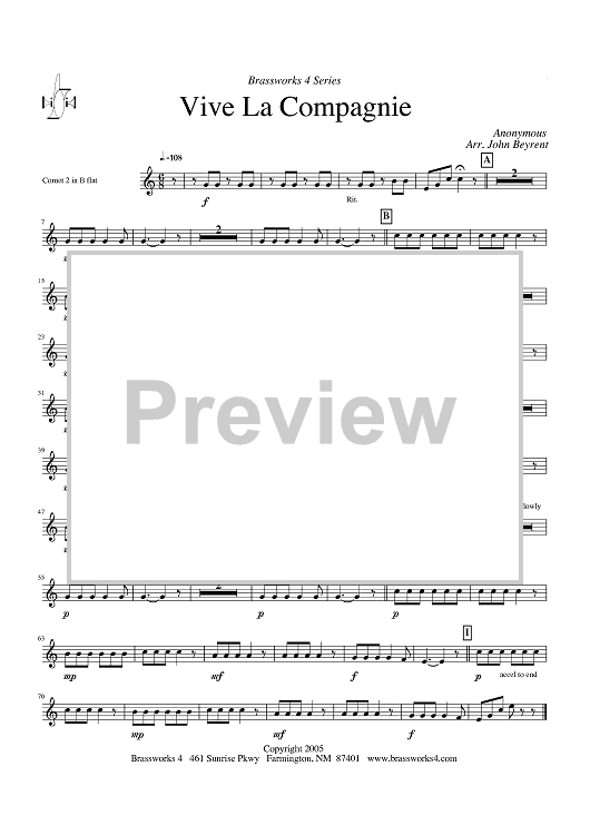 Digital Sheet Music for Vive La Compagnie - Cornet 2 in Bb by John Beyrent, Anonymous scored for Brass Ensemble; id:428372