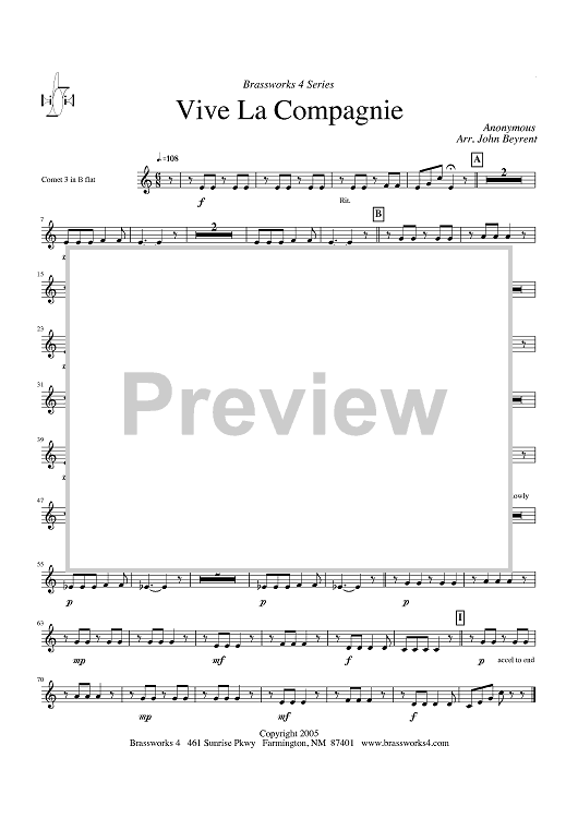 Digital Sheet Music for Vive La Compagnie - Cornet 3 in Bb by John Beyrent, Anonymous scored for Brass Ensemble; id:428373