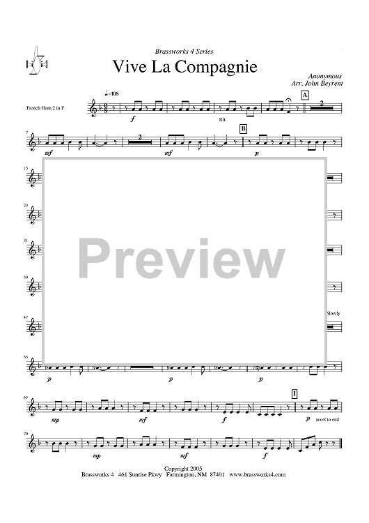 Digital Sheet Music for Vive La Compagnie - Horn 2 in F by John Beyrent, Anonymous scored for Brass Ensemble; id:428375