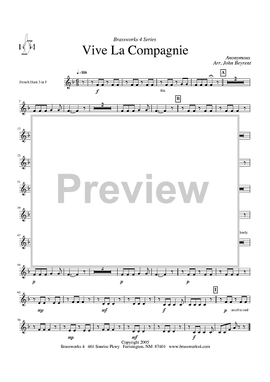 Digital Sheet Music for Vive La Compagnie - Horn 3 in F by John Beyrent, Anonymous scored for Brass Ensemble; id:428376