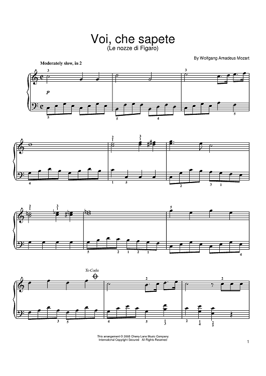"Voi, Che Sapete" Sheet Music by Wolfgang Amadeus Mozart