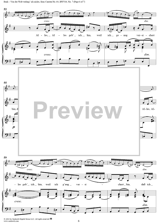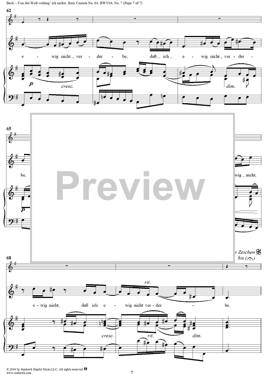 Digital Sheet Music for "Von der Welt verlang' ich nichts", Aria, No. 7 from Cantata No. 64: "Sehet, welch eine Liebe" - Piano Score by Johann Sebastian Bach scored for Alto, Oboe d'amore and Piano or Organ; id:303591