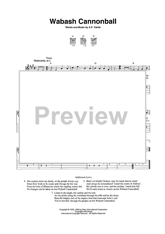 Digital Sheet Music for Wabash Cannonball by The Carter Family, A. P. Carter scored for Easy Guitar Tab/Vocal/Chords; id:456818