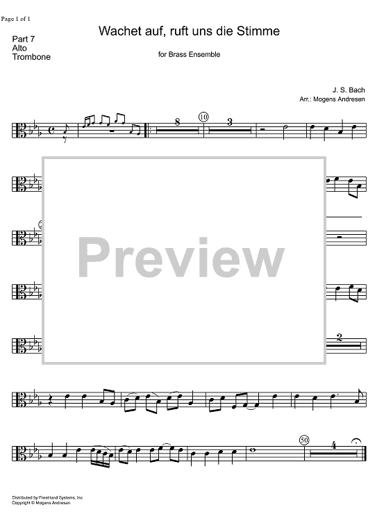 Digital Sheet Music for Wachet auf, ruft uns die Stimme - Alto Trombone by Mogens Andresen, Johann Sebastian Bach scored for Brass Ensemble; id:330101