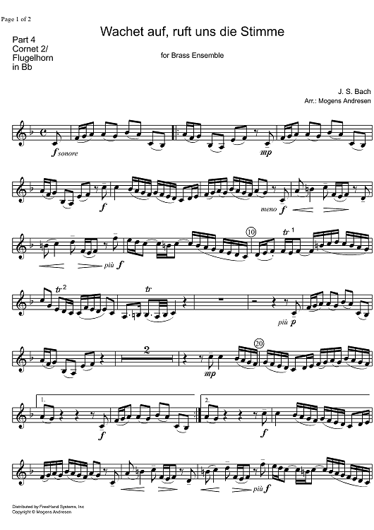Digital Sheet Music for Wachet auf, ruft uns die Stimme - B-flat Cornet 2/Flugelhorn by Mogens Andresen, Johann Sebastian Bach scored for Brass Ensemble; id:330095