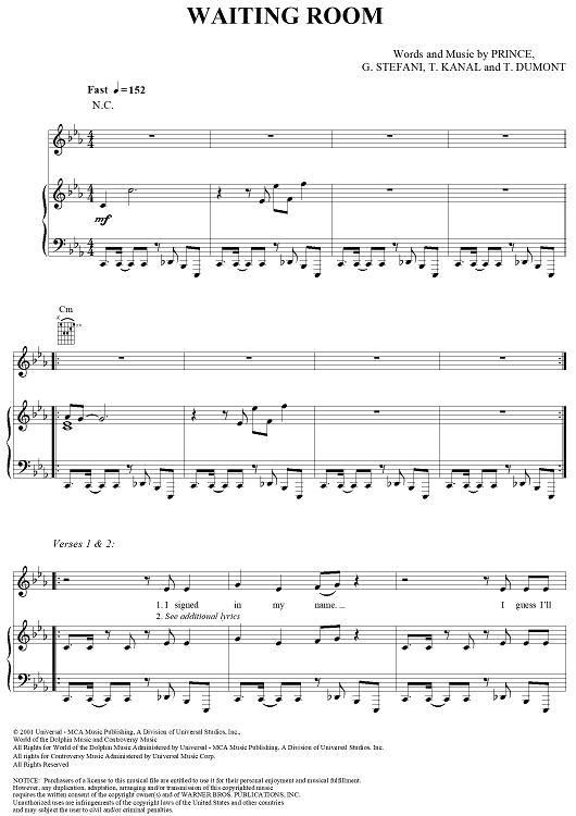 Digital Sheet Music for Waiting Room by No Doubt, Tom Dumont, Tony Kanal, Gwen Stefani scored for Piano/Vocal/Chords; id:293587
