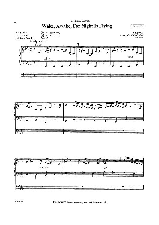 Digital Sheet Music for Wake, Awake, For Night Is Flying by Johann Sebastian Bach, Lani Smith scored for Organ Solo; id:434791