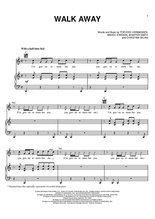 Digital Sheet Music for Walk Away by Christina Milian, Tor Erik Hermansen, Ne-Yo, Emilio Cancio-Bello, Paula DeAnda, Mikkel Eriksen scored for Piano/Vocal/Chords; id:395027