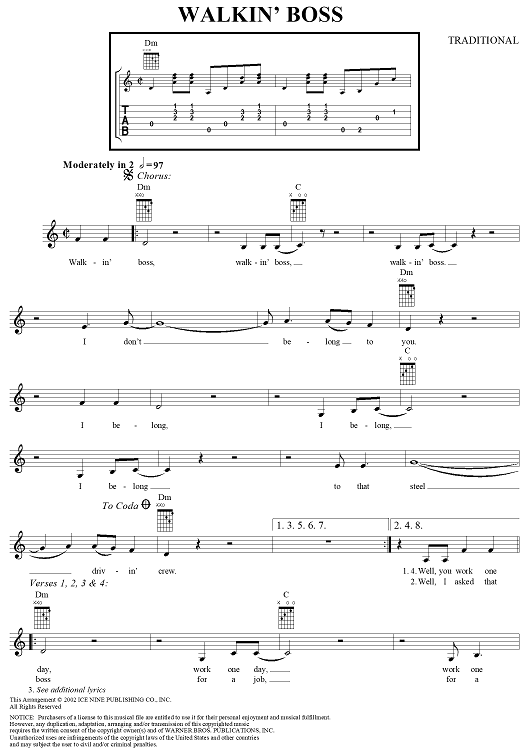 Digital Sheet Music for Walkin' Boss by Jerry Garcia, Traditional scored for Easy Guitar Tab/Vocal; id:291739