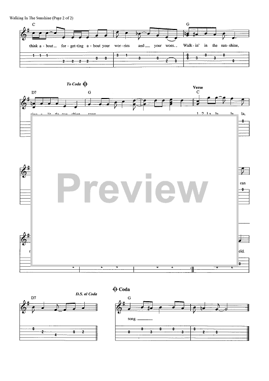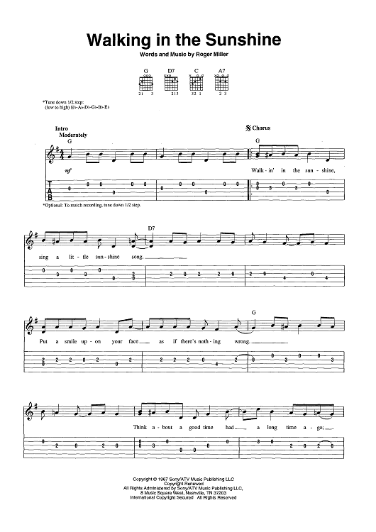 Digital Sheet Music for Walking in the Sunshine by Roger Miller scored for Easy Guitar Tab/Vocal/Chords; id:456831