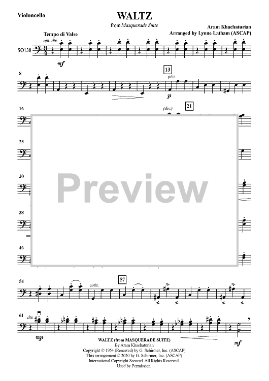 Digital Sheet Music for Waltz from Masquerade Suite (intermediate arrangement) - Cello by Aram Khachaturian, Lynne Latham scored for String Orchestra; id:503226