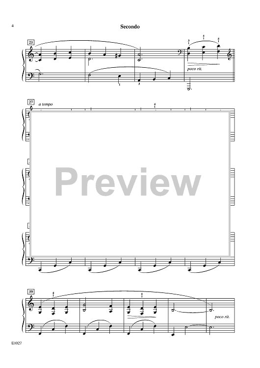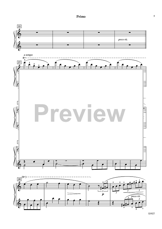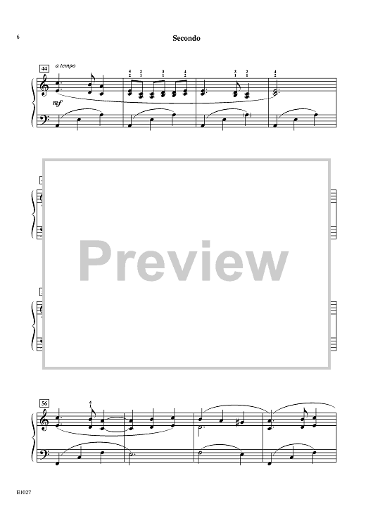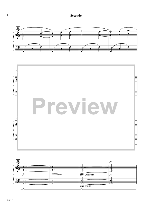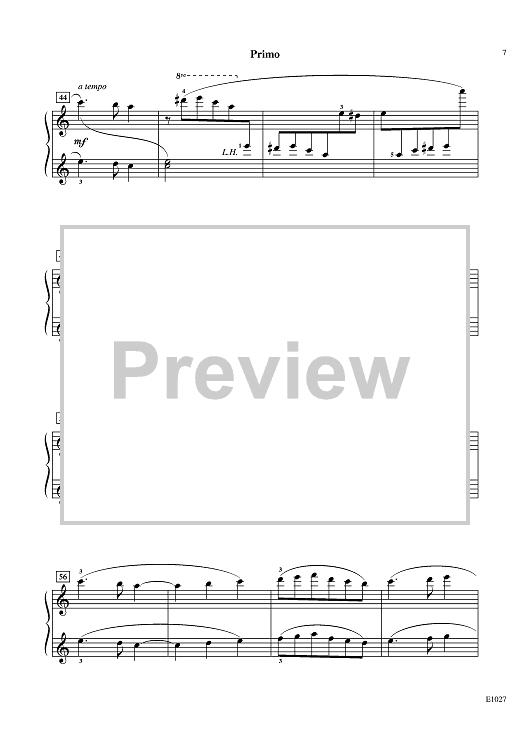 The moving melody of this ensemble piano piece sings a melancholy song in the secondo, with sustained, four-measure phrasing. The theme is lightly answered with dancing eighth notes in the primo, which add depth of expression. A countermelody is introduced in time for primo to take over the theme. Consider this waltz as a wonderful invitation to experience the sweep of 3/4 meter, and its dramatic effects.