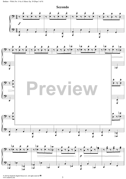 Digital Sheet Music for Waltz No. 14 in A Minor by Johannes Brahms scored for 1 Piano, 4 Hands; id:303981