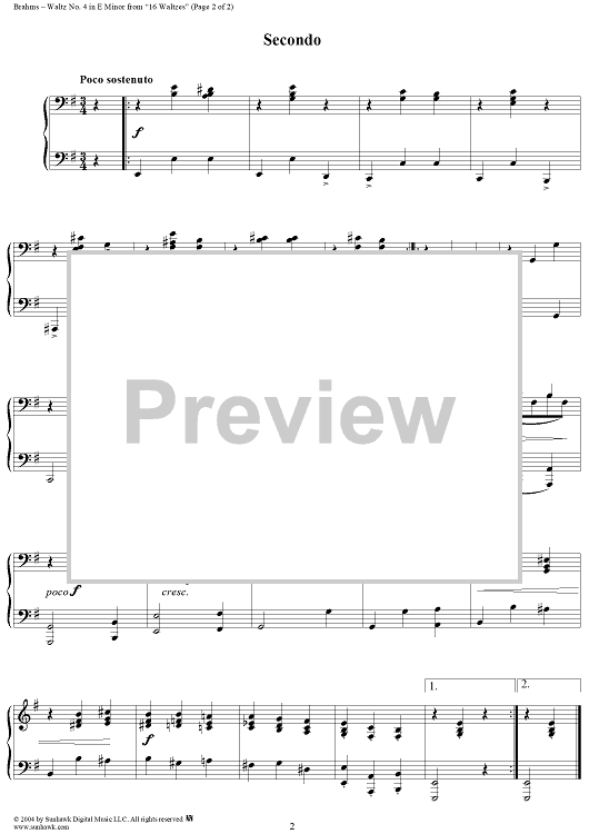 Digital Sheet Music for Waltz No. 4 in E Minor by Johannes Brahms scored for 1 Piano, 4 Hands; id:303968
