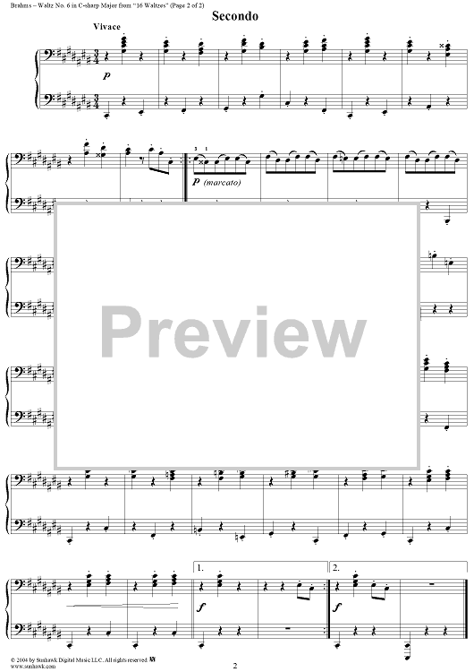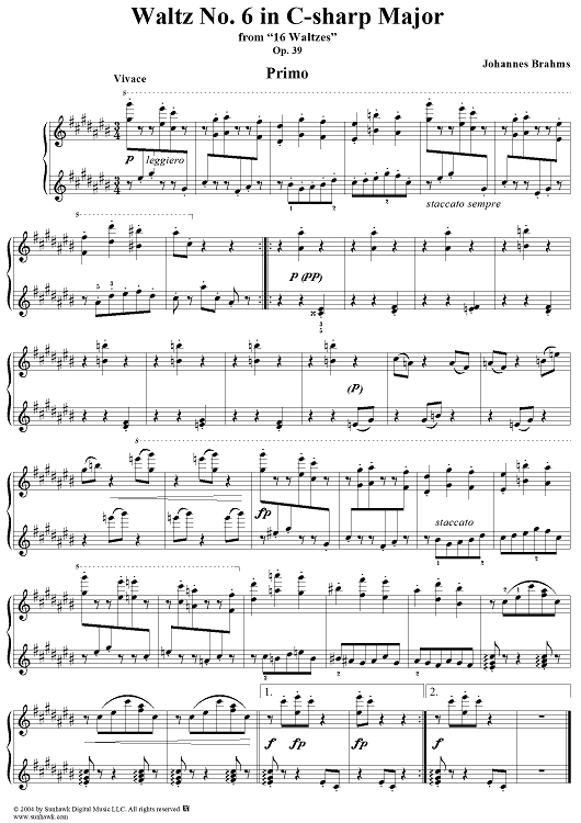 Digital Sheet Music for Waltz No. 6 in C-sharp Major by Johannes Brahms scored for 1 Piano, 4 Hands; id:303970