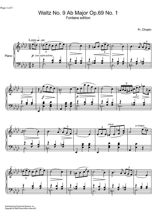 Digital Sheet Music for Waltz No. 9 Ab Major Op.69 No. 1 (Fontana) by Frederic Chopin scored for Piano Solo; id:335801