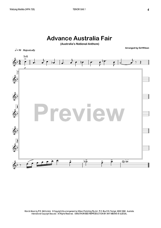 Digital Sheet Music for Waltzing Matilda & Advance Australia Fair - Tenor Sax 1 by Marie Cowan, Ed Wilson, A.B. Patterson, P.D. McCormick scored for Jazz Ensemble; id:356794