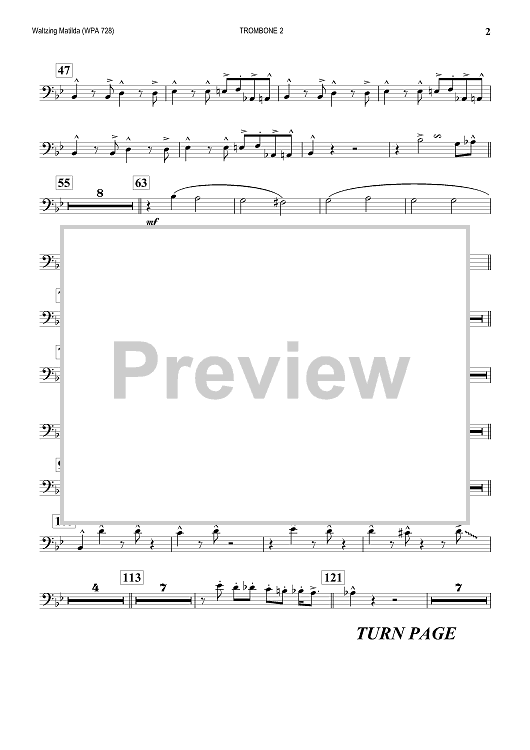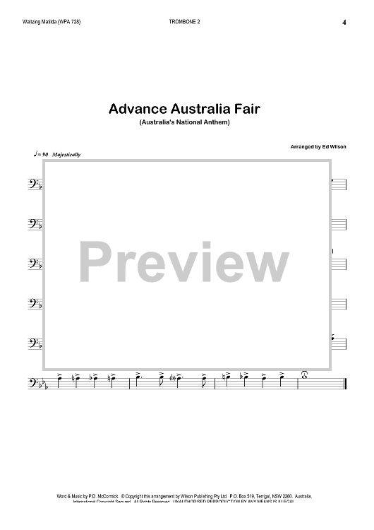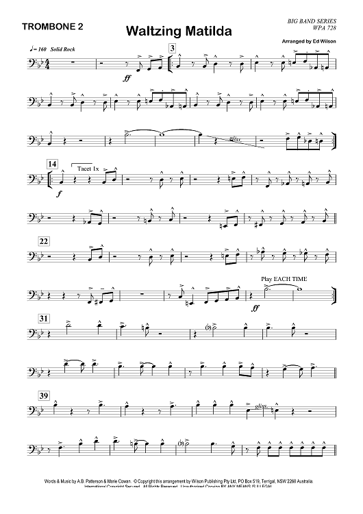 Digital Sheet Music for Waltzing Matilda & Advance Australia Fair - Trombone 2 by Marie Cowan, Ed Wilson, A.B. Patterson, P.D. McCormick scored for Jazz Ensemble; id:356802