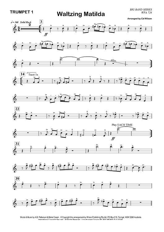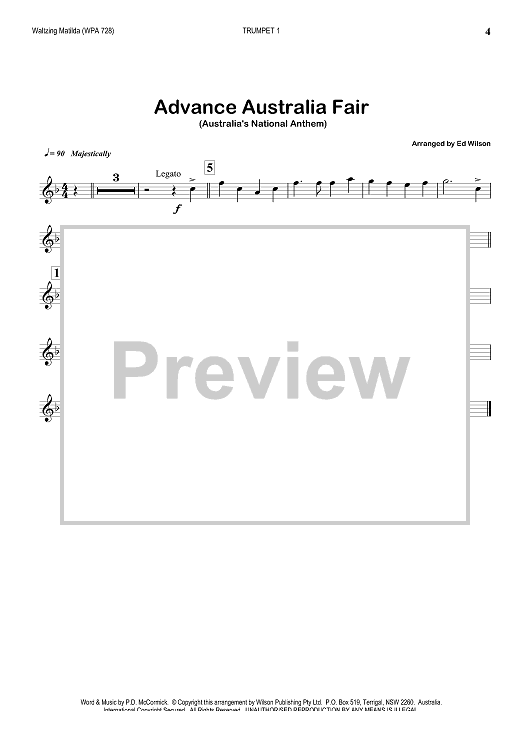Digital Sheet Music for Waltzing Matilda & Advance Australia Fair - Trumpet 1 by Marie Cowan, Ed Wilson, A.B. Patterson, P.D. McCormick scored for Jazz Ensemble; id:356797