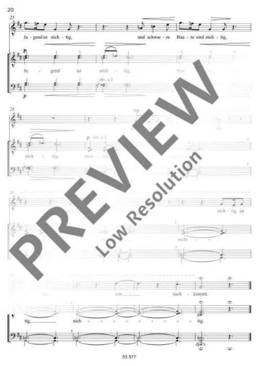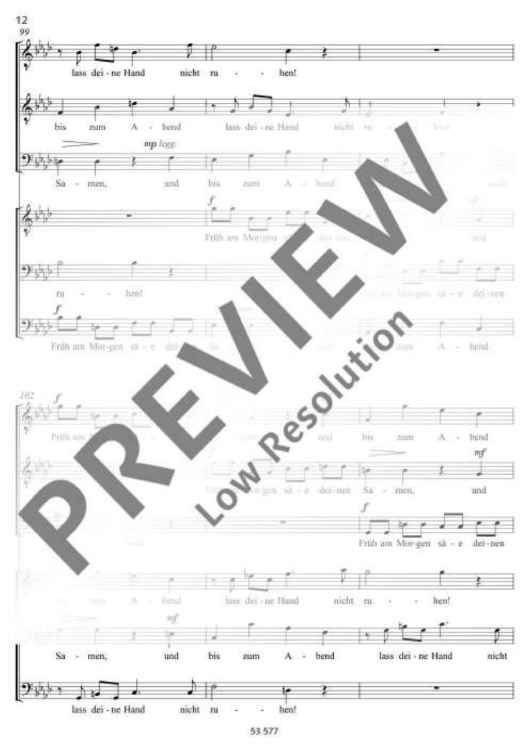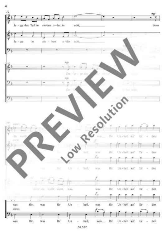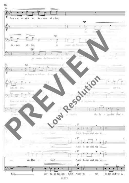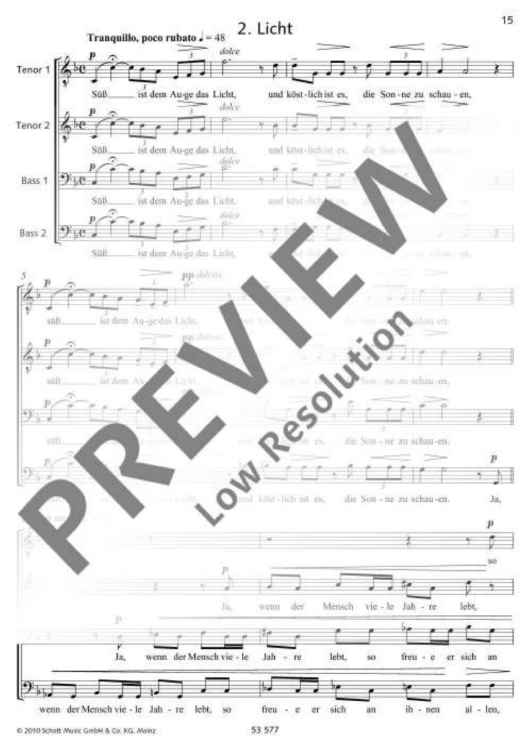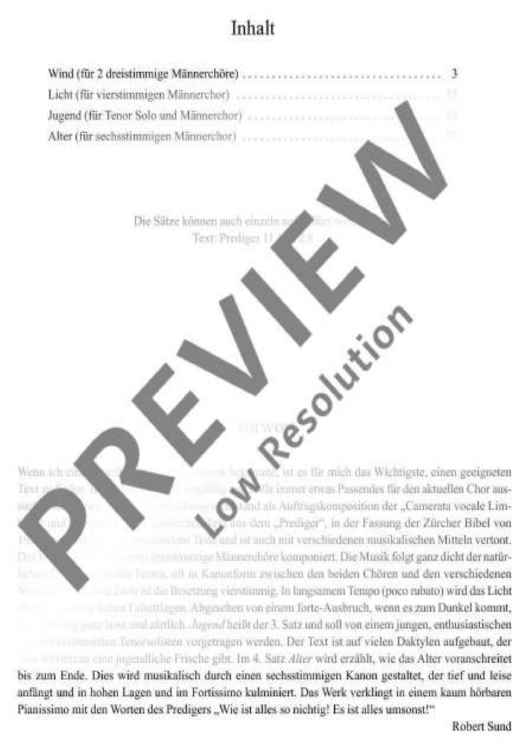 Commissioned by the Camerata vocale Limburg, this piece uses a sacred text from 'Ecclesiastes' in the version of the Zurich Bible of 1931. The text is made up of four different parts and set to music with different musical means. The first movement Wind has been composed for two three-part male-voice choirs. The music closely follows the natural declamation of the text, often in the form of a canon between the two choirs and the different voices. The second movement Licht is written for four parts. The light is presented in a slow tempo (poco rubato), often in high falsetto registers. Except for a forte outburst when darkness comes, the sound is very soft and gentle. The third movement is called Jugend and shall be performed by a young, enthusiastic and carefree tenor soloist. The text is based on many dactyls which gives the rhythm a youthful freshness. The fourth movement Alter tells how age progresses until the end. This is presented musically by a six-part canon which begins deep and soft and eventually culminates in high registers and a fortissimo. The work fades in a hardly audible pianissimo with the words of the preacher 'How everything is null and void! Everything is in vain!' (Robert Sund). Duration: 10 minutes.