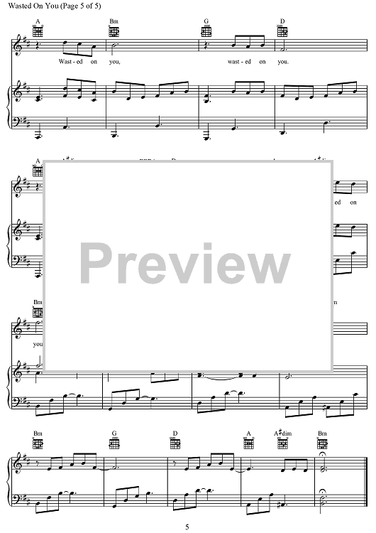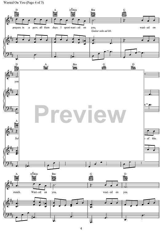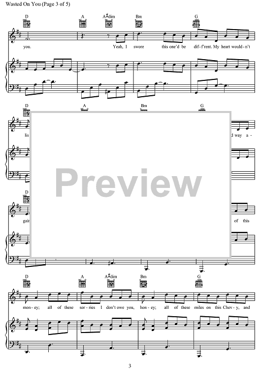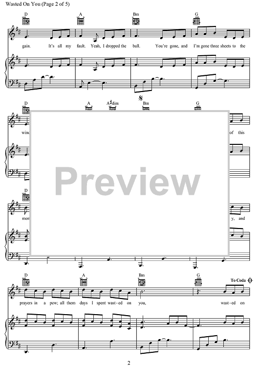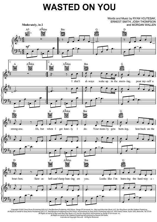 Digital Sheet Music for Wasted On You by Joshua Thompson, Ernie Smith, Morgan Wallen, Ryan Vojtesak scored for Piano/Vocal/Chords; id:500133