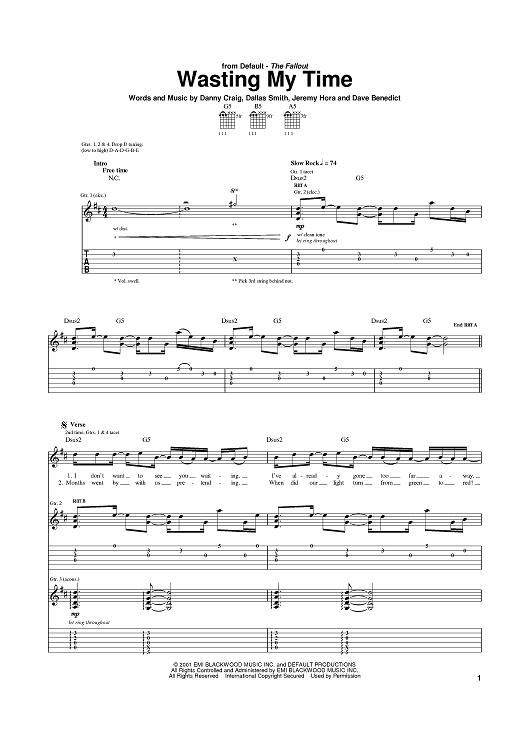 Digital Sheet Music for Wasting My Time by Dave Benedict, Danny Craig, Default, Dallas Smith scored for Guitar Tab; id:367826