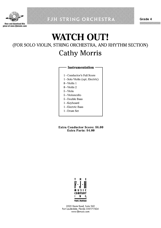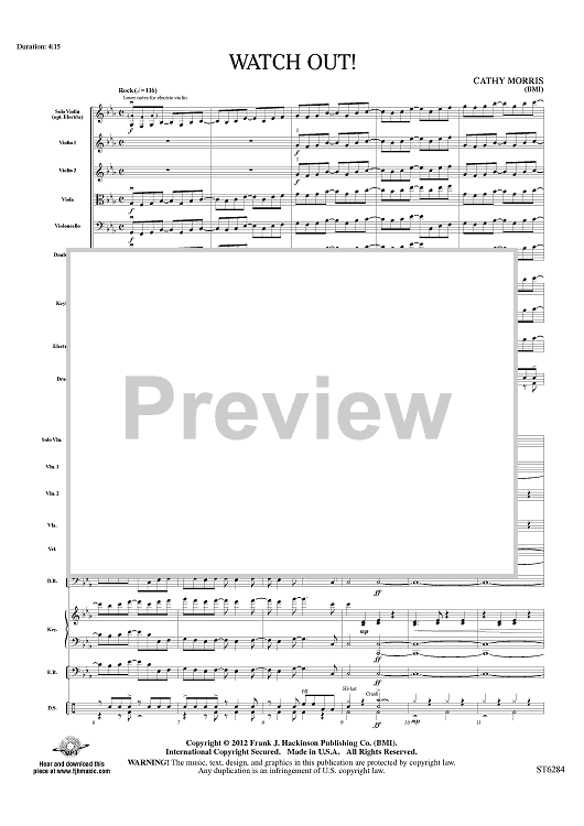 Digital Sheet Music for Watch Out! - Score by Cathy Morris scored for Solo Violin, String Orchestra and Rhythm Section; id:432086