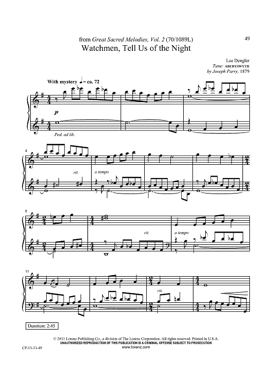 Digital Sheet Music for Watchmen, Tell Us of the Night by Joseph Parry, Lee Dengler scored for Piano Solo; id:434606
