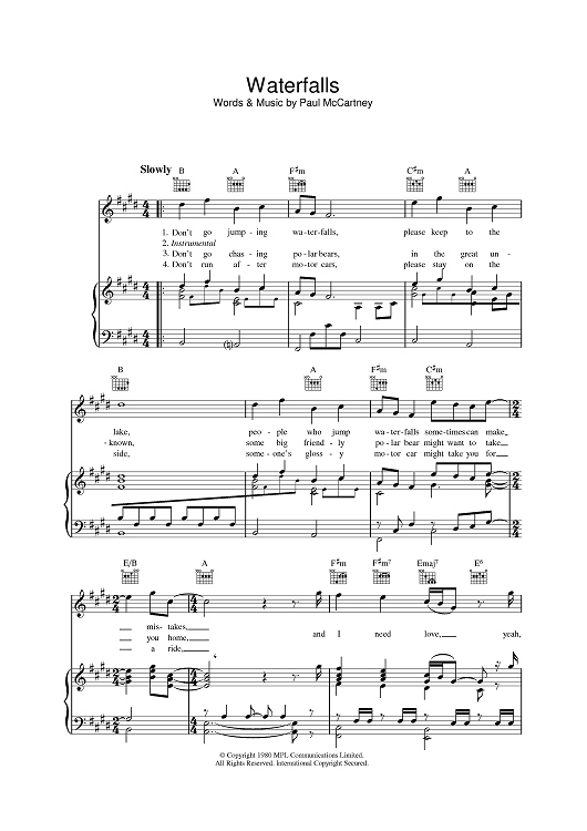 Digital Sheet Music for Waterfalls by Paul McCartney scored for Piano/Vocal/Chords; id:390001