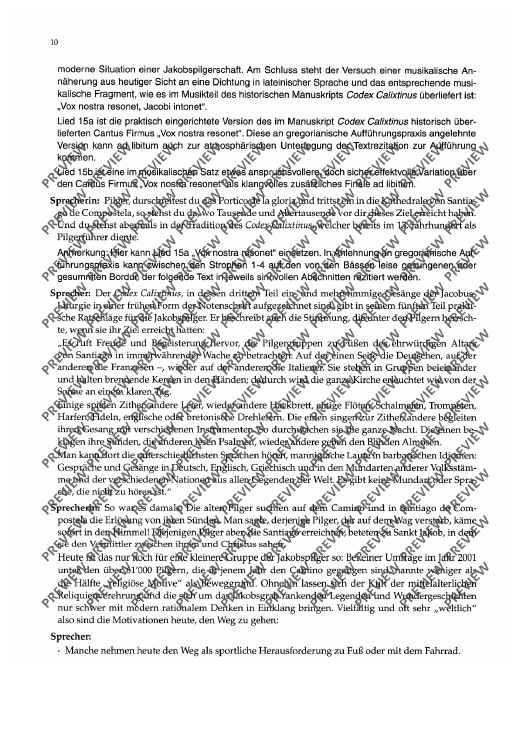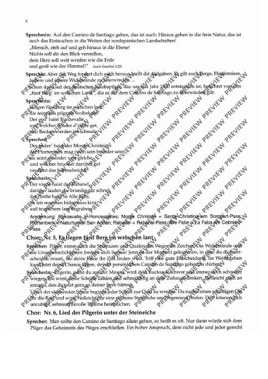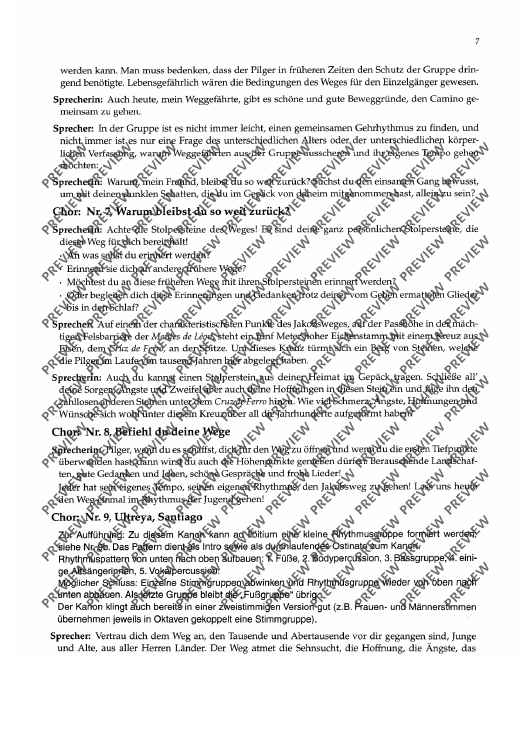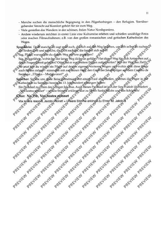 Als "Camino de Santiago", dem Jakobsweg, werden die verschiedenen Pilgerweg zur vermuteten Grabstätte des Apostels Jakobus dem Älteren im spanischen Santiago de Compostela bezeichnet. Die Pilgerwege - heute europäische Kulturstrassen - sind seit dem Mittelalter bekannt und im "Liber Sancti Jacobi", einer Handschriften des 12. Jh. beschrieben. Die vorliegende kleine Kantate betrachtet den Pilger auf dem Jakobsweg aus heutiger Sicht, greift aber auch auf die Geschichte des Pilgerweges zurück; die verbindenden Texte wechseln sich mit den Chorsätzen ab. Die Chorsätze sind - mit Ausnahme des abschliessenden "Vox nostra resonet", der nach Belieben auch fortgelassen werden kann - in deutscher Sprache.