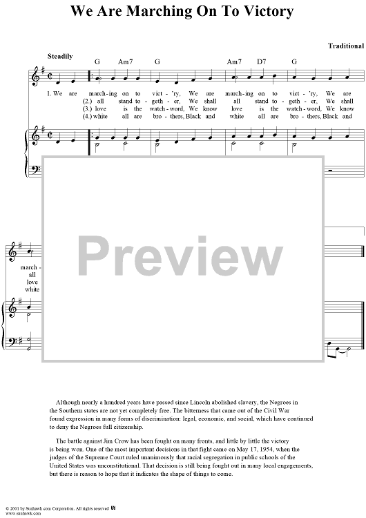 Digital Sheet Music for We Are Marching On to Victory by Traditional scored for Piano/Vocal/Chords; id:262009