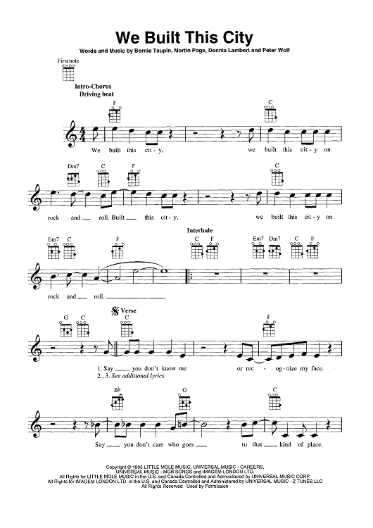 Digital Sheet Music for We Built This City by Dennis Lambert, Bernie Taupin, Martin Page, Peter Wolfe scored for Ukulele/Vocal; id:465320