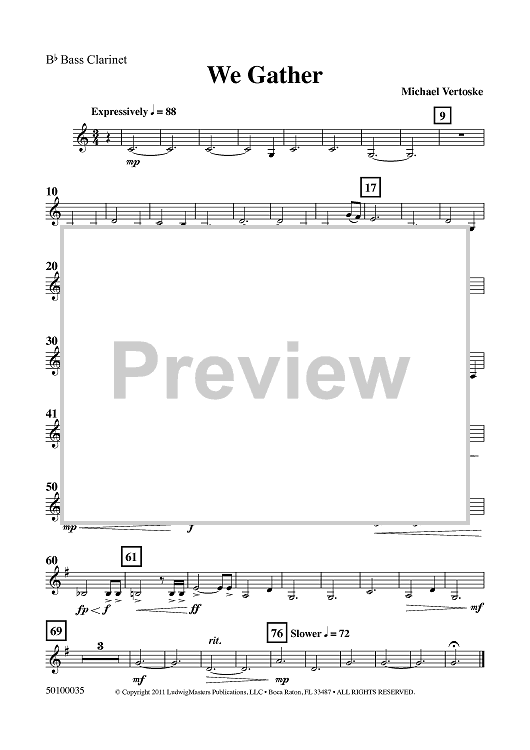 Digital Sheet Music for We Gather - Bass Clarinet by , Michael Vertoske, Adrianus Valerius scored for Developing Band; id:437209