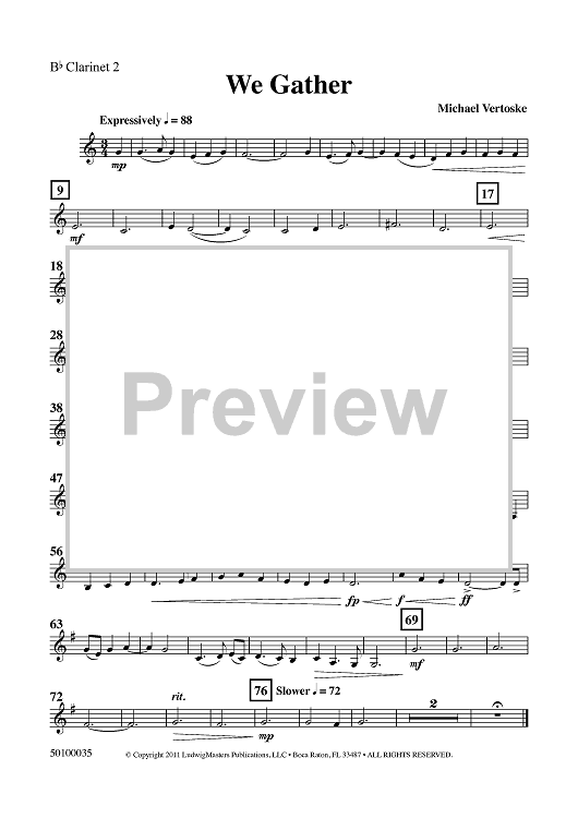 Digital Sheet Music for We Gather - Bb Clarinet 2 by , Michael Vertoske, Adrianus Valerius scored for Developing Band; id:437207