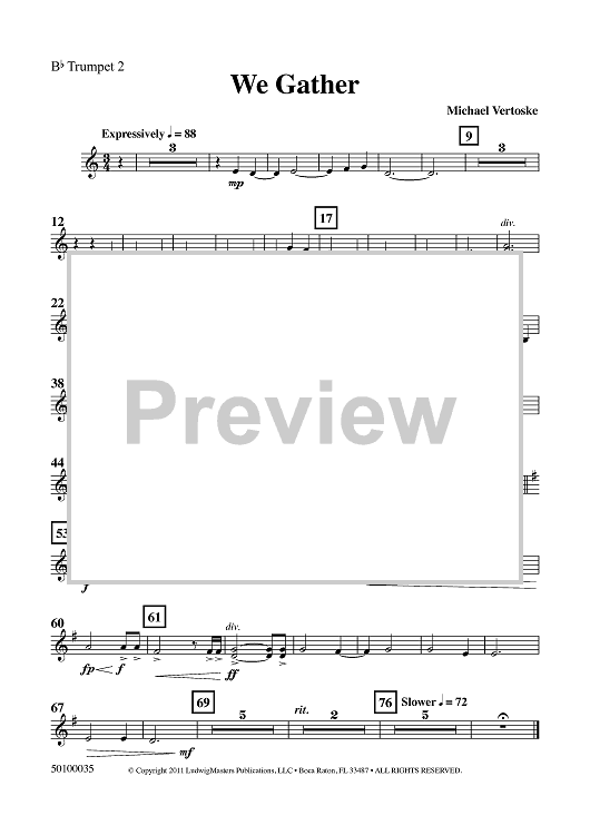 Digital Sheet Music for We Gather - Bb Trumpet 2 by , Michael Vertoske, Adrianus Valerius scored for Developing Band; id:437214