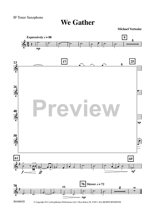 Digital Sheet Music for We Gather - Tenor Sax by , Michael Vertoske, Adrianus Valerius scored for Developing Band; id:437211
