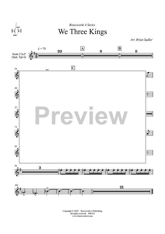 Digital Sheet Music for We Three Kings - Trumpet 6 in Bb or Horn 2 in F by Traditional, Brian Sadler scored for Brass Ensemble; id:428459