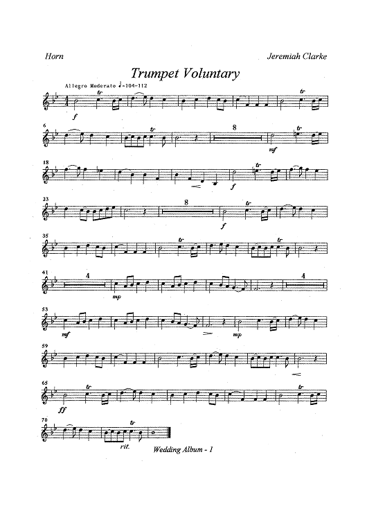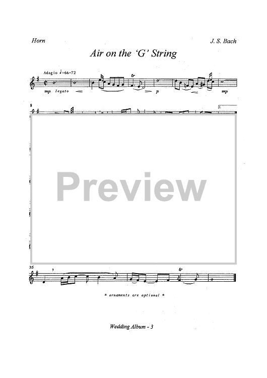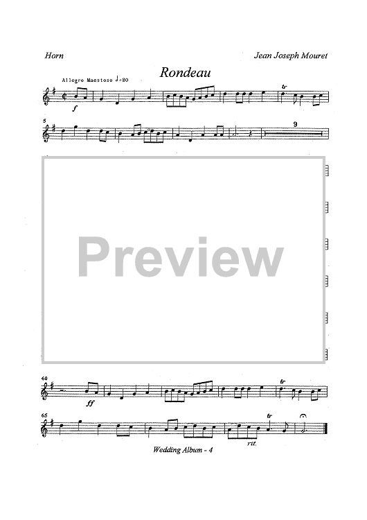 Arrangements of Air on the G string (Bach), St Anthony Chorale (Haydn), Rondeau (Mouret), and Voluntary (Clarke). "If wedding jobs are in your future, you should buy this collection." The Horn Call, November 1998