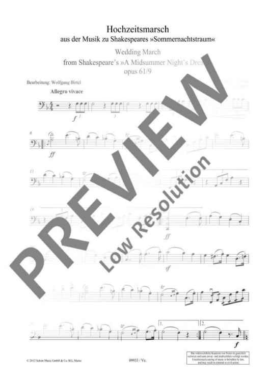 A wedding without a famous wedding march – unimaginable! Wagner's 'Bridal Chorus' from 'Lohengrin' and Mendelssohn's 'Wedding March' from the incidental music of 'A Midsummer Night's Dream' vie for the favour of bridal couples and wedding parties. If, however, the music shall be festive, Mendelssohn's background music for the wedding ceremony remains first choice. In order that the march cannot only be performed with the organ but also with a melodic instrument with piano (or organ) accompaniment, the present editions provide easy-to-play arrangements.