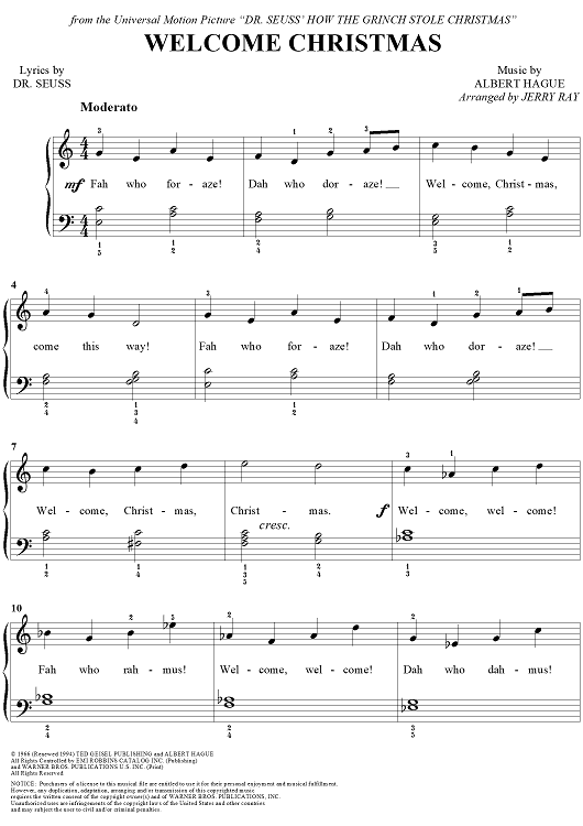 Digital Sheet Music for Welcome Christmas by Jerry Ray, Dr. Seuss, Albert Hague scored for Easy Piano/Vocal; id:286180