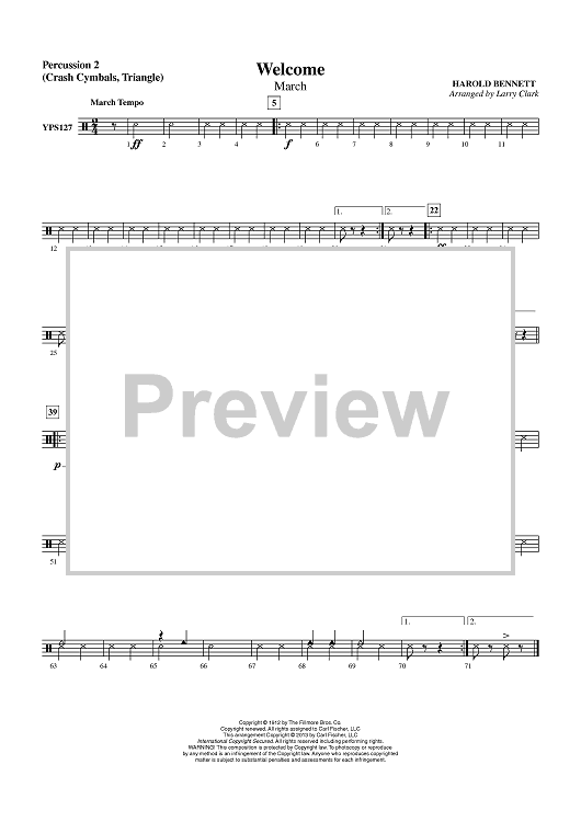 Digital Sheet Music for Welcome (March) - Percussion 2 by Larry Clark, Harold Bennett scored for Concert Band; id:436441